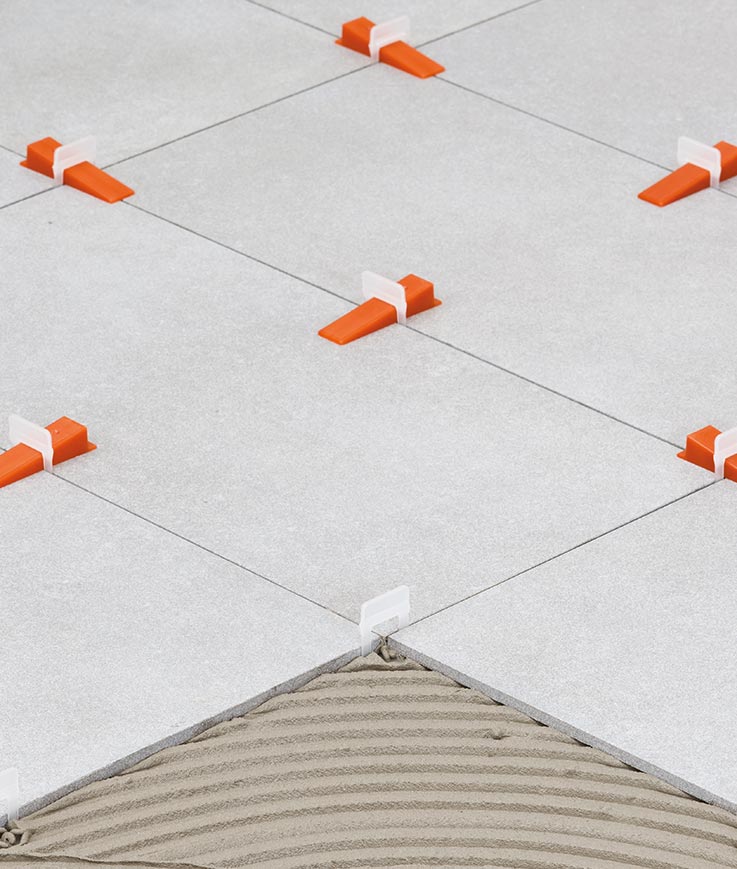 Les coins R.L.S. s’insèrent entre les carreaux pour mettre à niveau ceux-ci l’un avec l’autre.